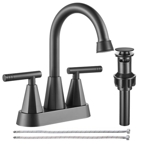 Cobbe Black Bathroom Faucets 3 Hole, 4 Inch Bathroom Sink Faucet with Pop Up Drain and 2 Supply Hoses, 2 Handle Centerset Bathroom Faucet for Sink Vanity, Matte Black