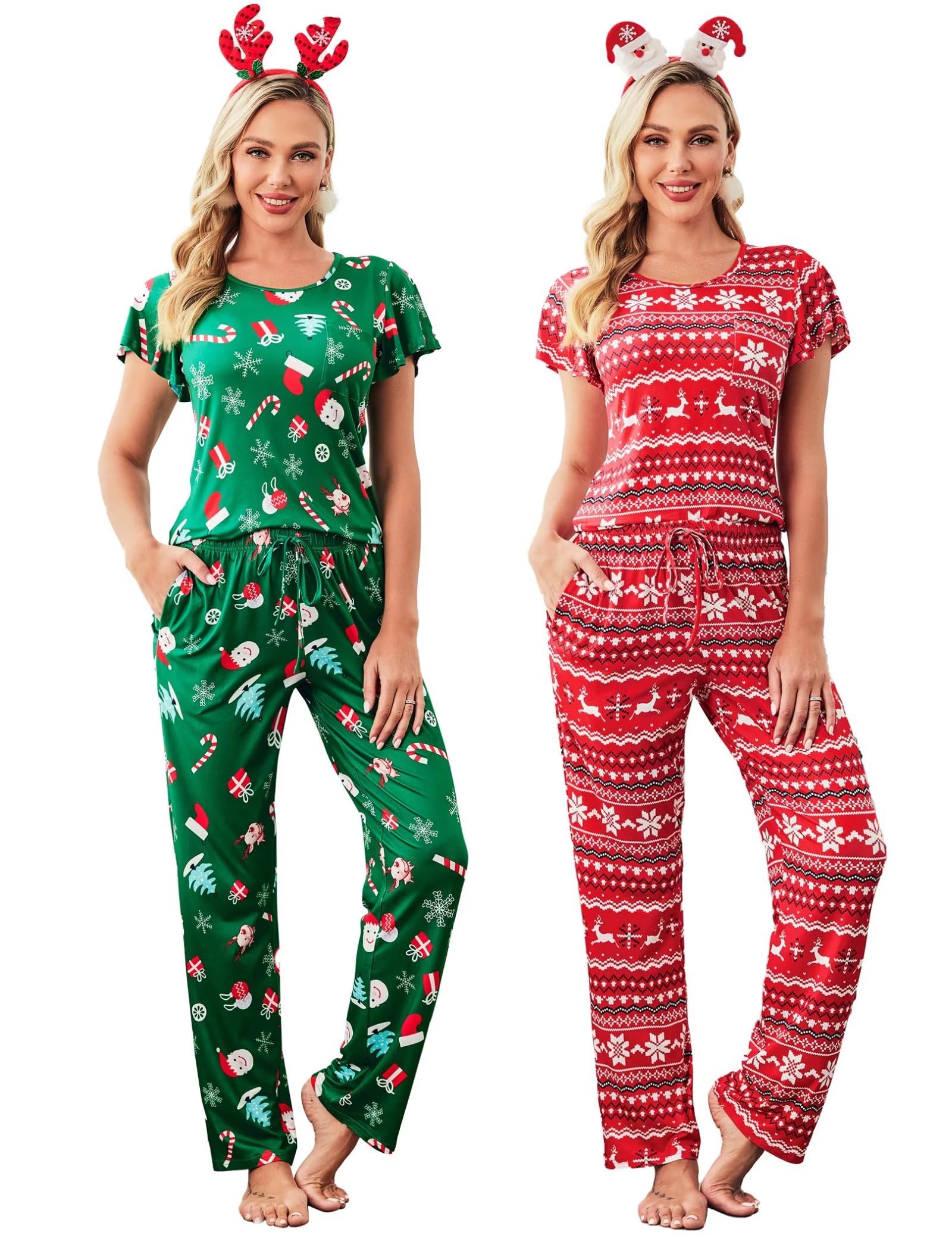 Ekouaer 2 Pack Womens Pajama Sets Short Sleeve with Long Pajama Pant Set Soft Sleepwear Printed Pj Lounge Set with Pockets