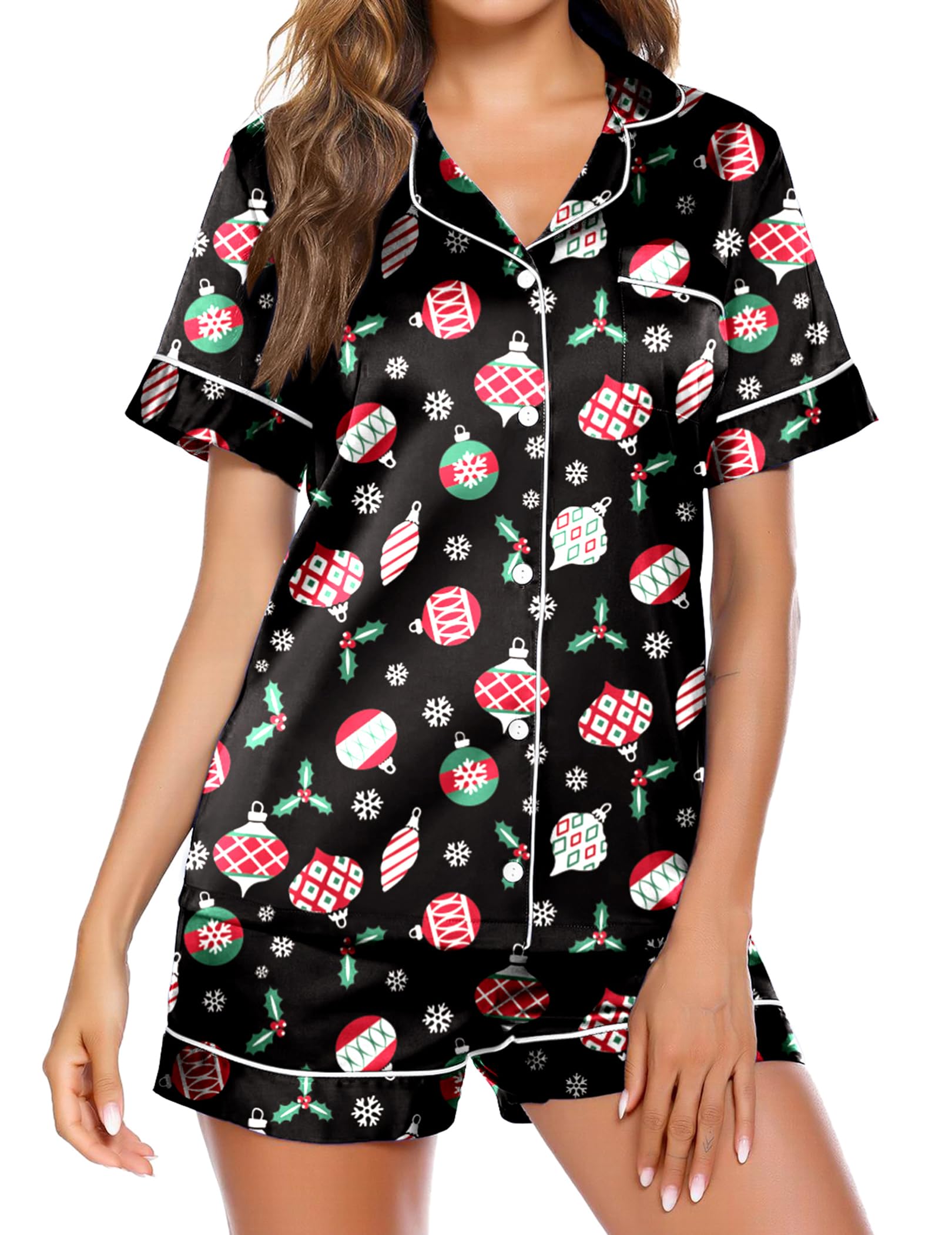 Ekouaer Christmas Pajama Set Women's Holiday Sleepwear Short Nightwear Set Button Down Satin Pj Lounge Set Soft 2 Piece Set (Christmas Pattern,L)
