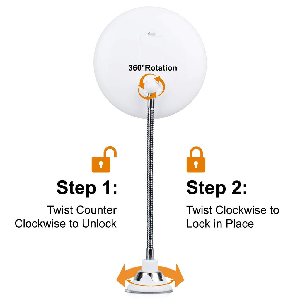 - Powerful Suction Cup - Simply twist to lock the suction cup on your mirror, bathroom wall, fully adjustable to any desired position