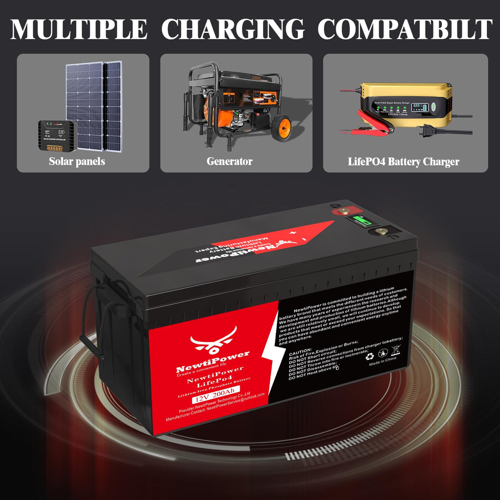 - 【Intelligent 150A BMS & MAX Load Power 1920W】: NewtiPower 12V 200Ah LiFePO4 battery is equipped with a built-in 150A BMS, which can prevent overcharging, over discharge, overcurrent, and short circuit. This BMS is already higher than the average level of BMS used in the same capacity batteries on the market, allowing us to connect to more usage scenarios and support a maximum load power of 1920W, so we no longer have to worry about the problem of load not running.