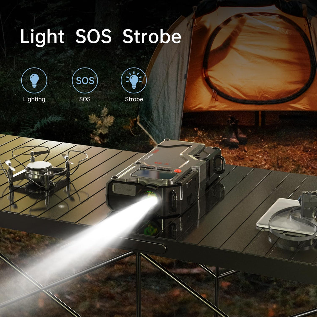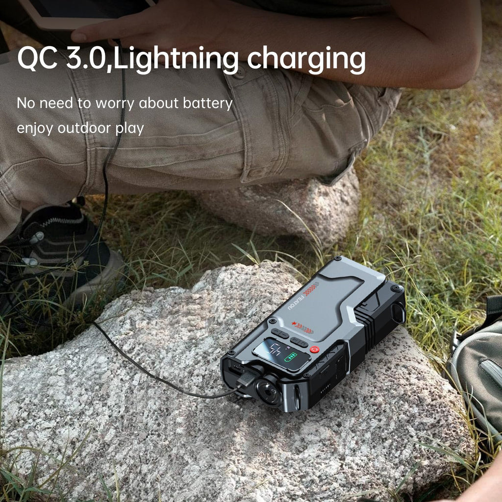 - 【Flashlight And Power Bank】In addition to being a car jump starter, it is also a portable power bank. It supports QC 3.0 fast charging technology, with a maximum Type C output of 18w. It can quickly charge your devices outdoors. It also has a flashlight function, equipped with 350 lumen LED Light, and supports three modes:Lighting、SOS、Strobe.
