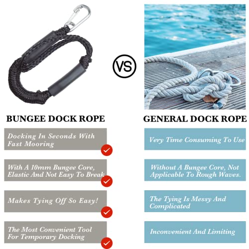 - High Visibility 316ss Hook:There Is A Marine Grade 316 Stainless Steel Clip At Both Ends Of The Newly Designed Ship Rope, Which Can Be Used To Easily Connect Rings Or Metal Eyes, And It Is Easy To Connect And Remove Without Tying. It Has Never Been Found That Berthing Is So Easy And Fast!Ach 2 Feett Bungee Dock Line Can Extend To 3 Feet, Making It Easy To Adjust According To The Position Of The Dock Plywood