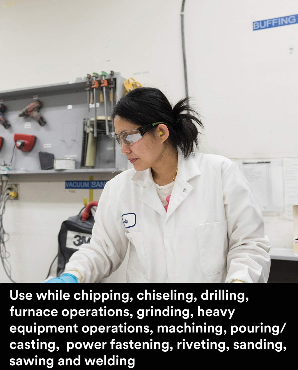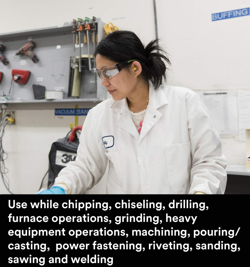 - Versatile: Use while chipping, chiseling, drilling, furnace operations, grinding, heavy equipment operations, machining, pouring/casting, power fastening, riveting, sanding, sawing and welding.