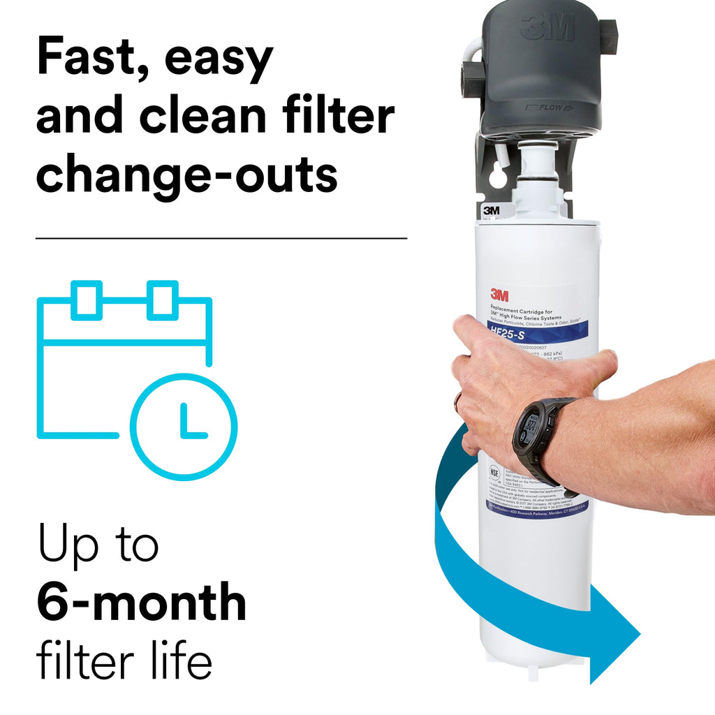 - EXCELLENT FILTRATION: 3M High Flow Series Replacement Cartridge, Model HF25-S, specifically designed for filtering water for commercial ice machines, helping ensure your ice looks and tastes great and enhancing the customer experience by reducing chlorine taste and odor and sediment/particulates for 10000 gallons and flowrate up to 1.5 gpm.