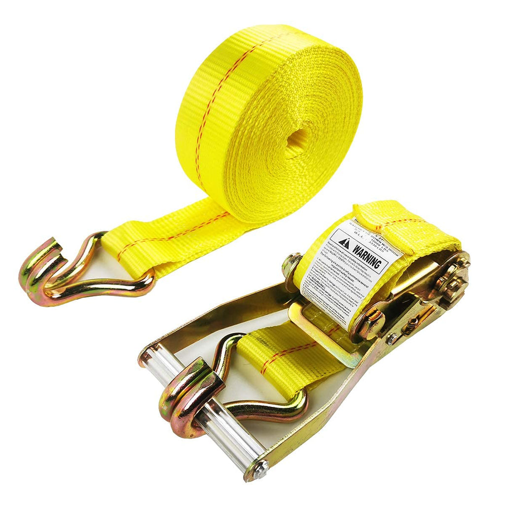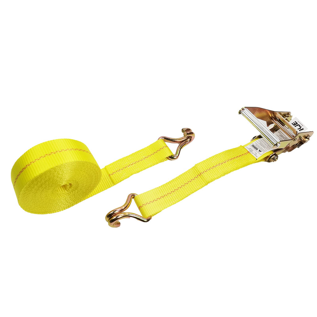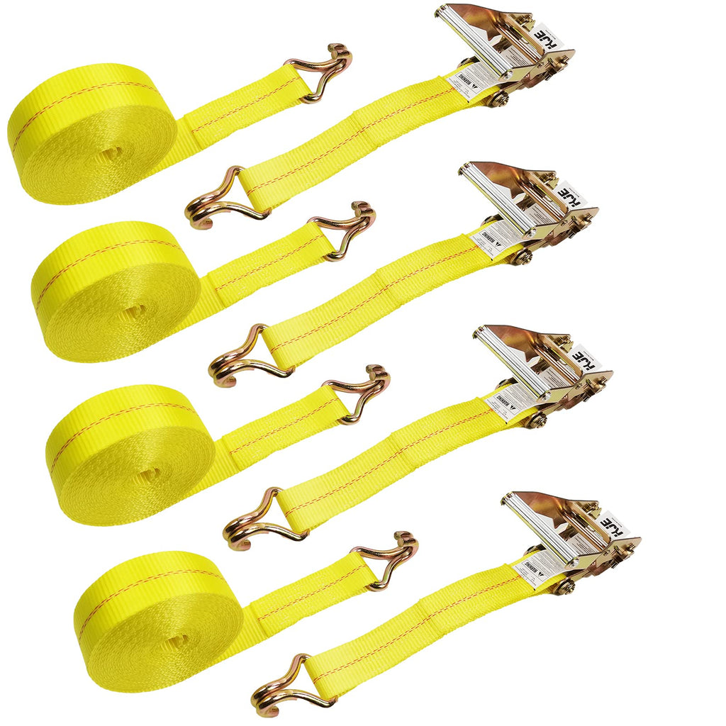 - You get: 2/4 large ratchet straps with double J hooks. These ratchet belts are 27 feet long and 2 inches wide. The assembled breaking strength is 10,000 pounds, and the working load limit is 3,333 pounds.