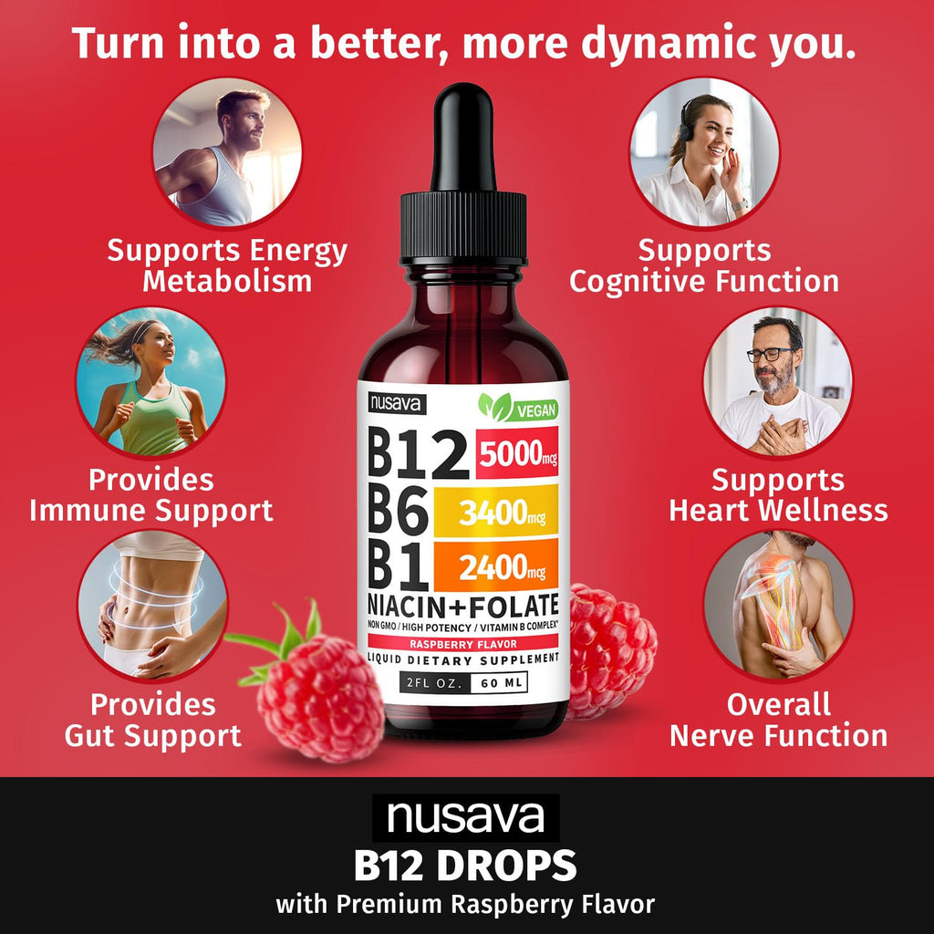 - B12 Drops Formulated for Maximum Potency - Our Liquid Vitamin B12 Drops contain Vit B12 5000mcg, B6, B1, Niacin, and Folic Acid, supporting overall body functions with 100% or more Daily Value.