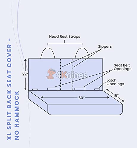 - Patented double L shape zipper opening design allows access to all three seat belts, latch anchors, and fold-down seats (only available from 4Knines); regular size measures 54 inches wide; US patent 9610877, 9878646