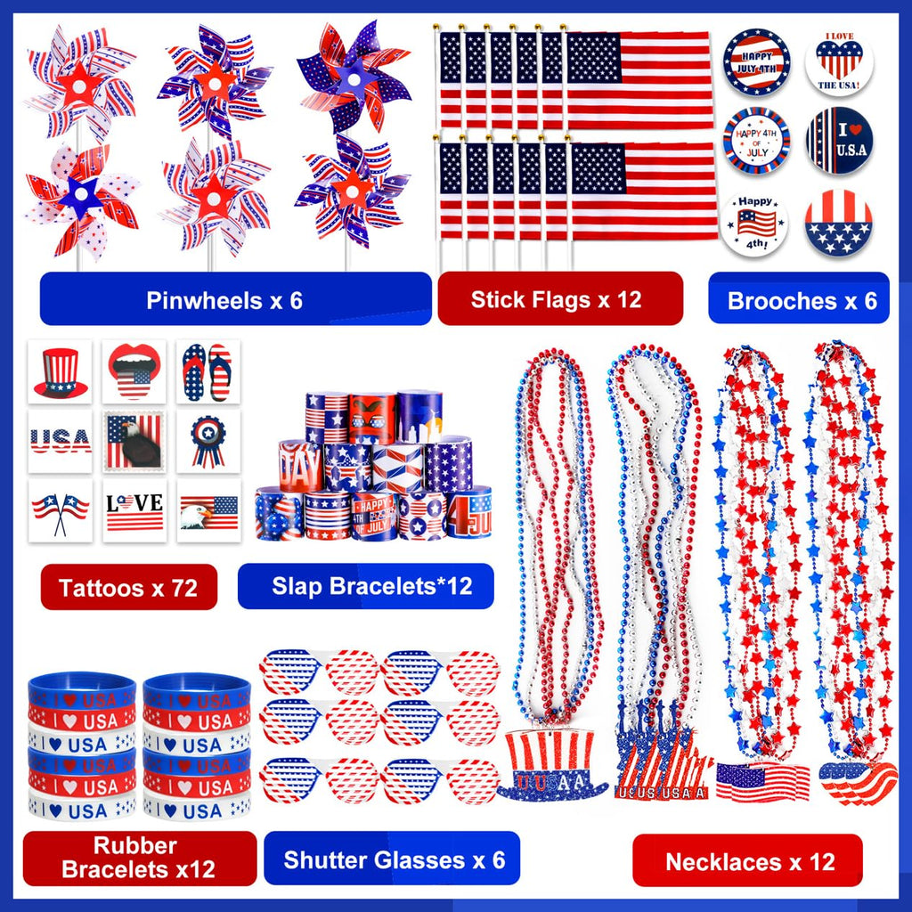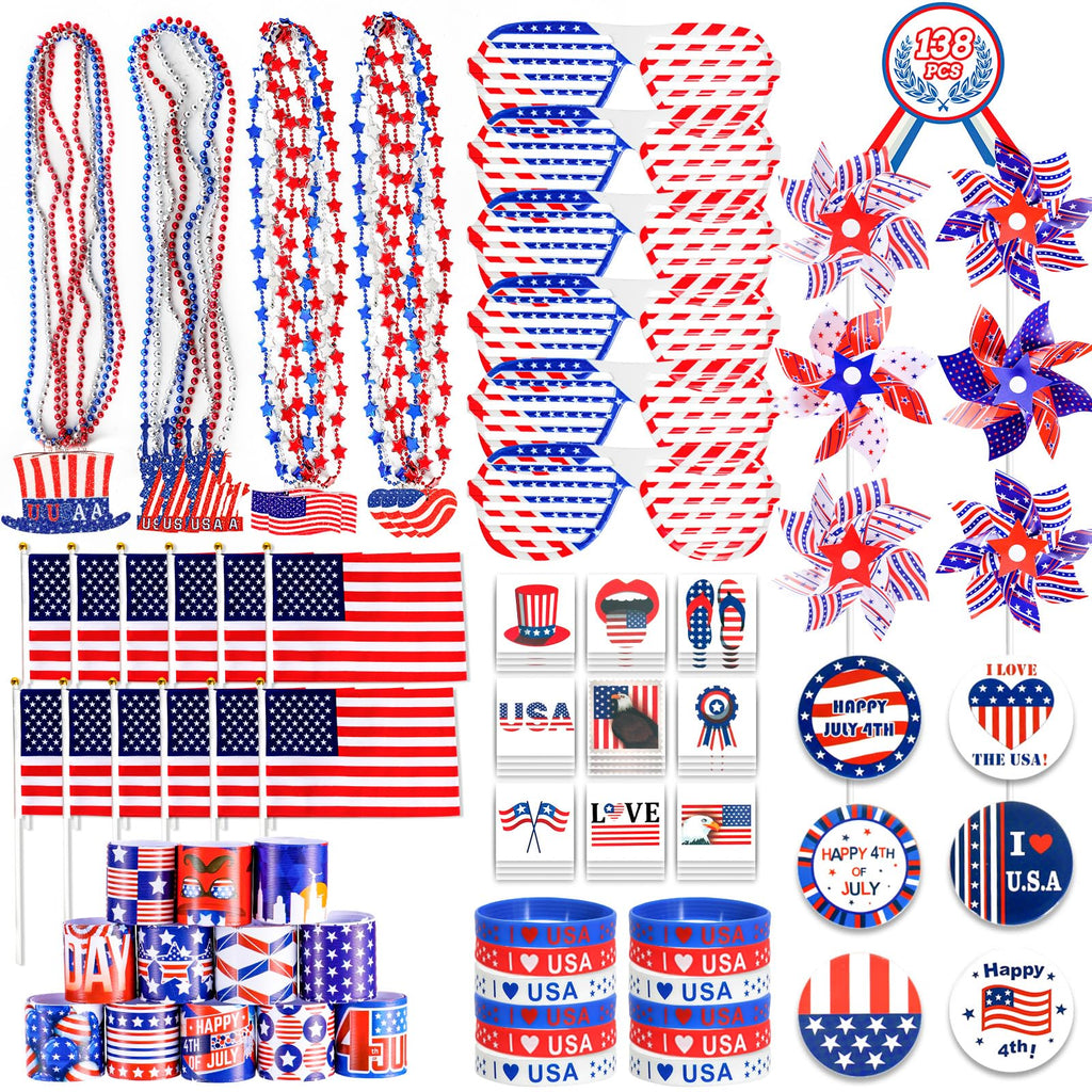 - 138Pcs Patriotic Party favors Set: Our Fourth of July Assortments includes 12 Pcs American Stick Flags, 6 Pcs Patriotic Pinwheels, 12 Pcs Beaded Necklaces (4 styles), 6 Pcs Shutter Glasses, 6 Pcs Patriotic Brooches, 12 Pcs Rubber Bracelets, 12Pcs Slap Bracelets, 72 xTemporary Tattoos. The quantity is sufficient to meet your needs of the patriotic decorations.