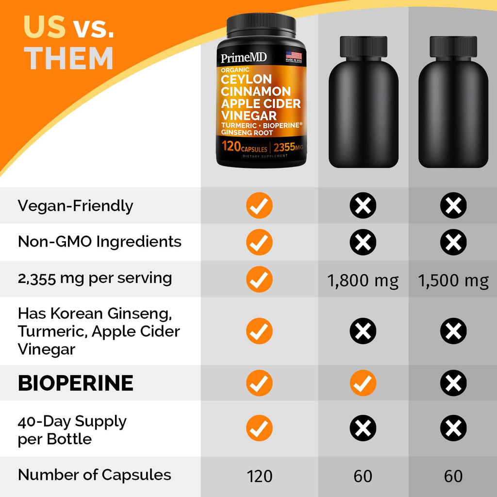 - Apple Cider Vinegar, Turmeric, Ginseng & Ceylon Cinnamon Supplement in One: Combining 4 esteemed superfoods, the PrimeMD Ceylon Cinnamon capsules provide you with an easier way to gain total wellness. With just 3 cinnamon capsules daily, supply your body with all the nutrients and healthy compounds essential to maintain normal blood pressure levels plus a whole host of health benefits