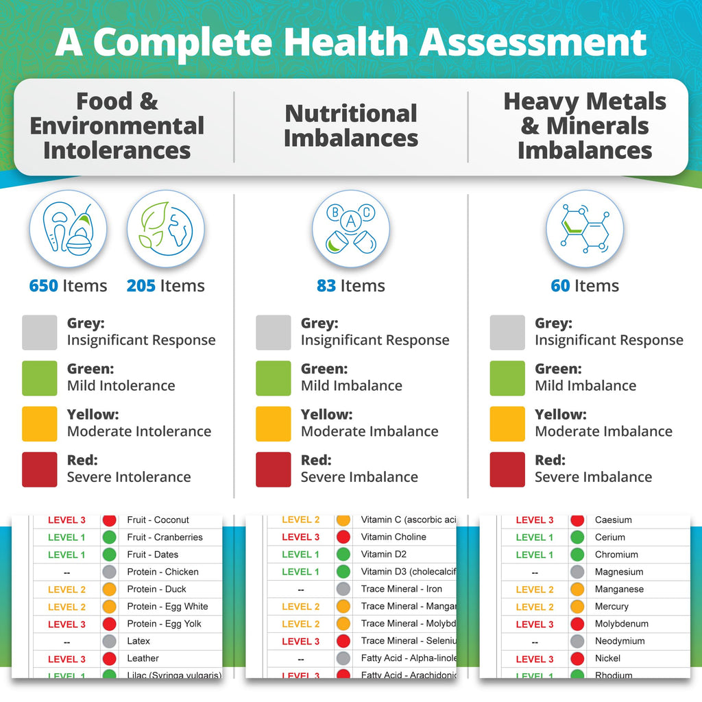 - TESTS 998 FOOD & ENVIRONMENTAL ITEMS. Our complete health assessment includes a food & environmental intolerance test kit, vitamin & mineral imbalance test, and heavy metals & minerals imbalance test. Your food intolerances may contribute to your imbalances, making it crucial to understand both at the same time (ex: your intolerances may cause inflammation at the cellular level, inhibiting proper nutrient absorption that leads to an imbalance.)