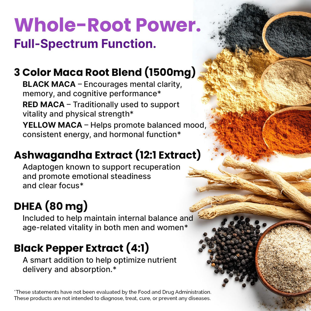 - Nutritional Powerhouse Maca Capsules - A natural blend of all yellow, red, and black maca root powders with Ashwagandha root, DHEA powder, and Black pepper fruit for sustained energy.