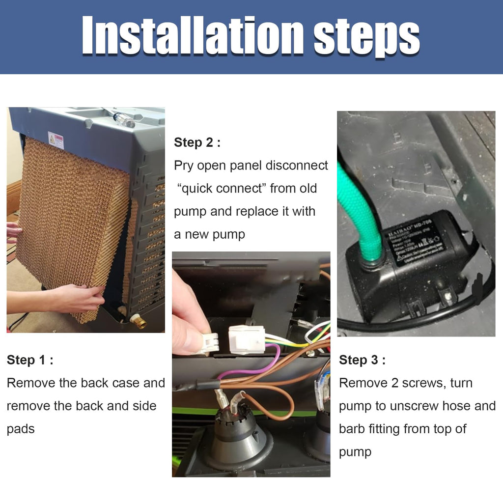 - East Installation - ①. Remove the back case and remove the back and side pads; ②. Pry open panel disconnect “quick connect” from old pump and replace it with a new pump; ③. Remove 2 screws, turn pump to unscrew hose and barb fitting from top of pump