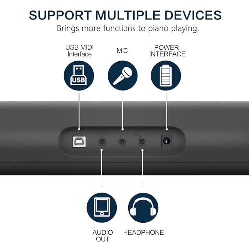 - USB-MIDI Connection: Allows connection to a Mac/PC to use educational piano lesson software to instruct you which key to press. With audio output/microphone/phone jack,you can connect microphone and headphone, you will not interfere with others when practicing singing and playing late at night, fully enjoy the music