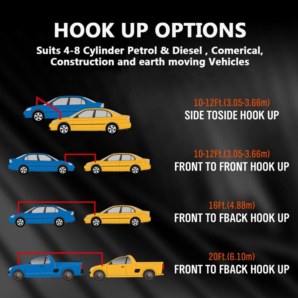 - Jumper Cable 25’ Feet Long, 1 Gauge, 800 AMP – Commercial Automotive Vehicle Booster Cables – Motorcycle Car ATV in your trunk or car emergency kit so you can safely boost jump your vehicle whenever need.