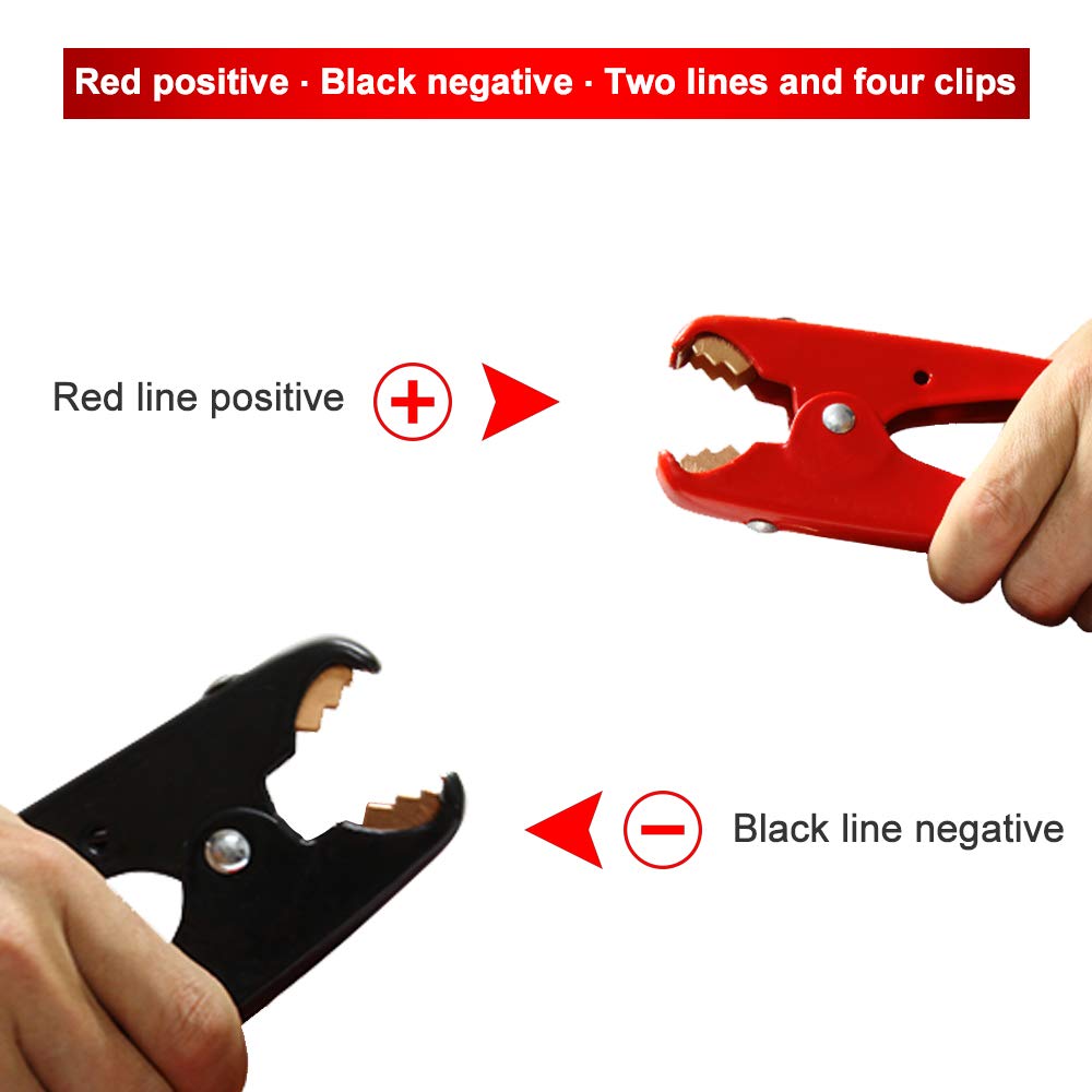 - Color identification of cables prevents crossing of wires; Red (+) Black (-), Including 1 AWG Copper Clad Aluminum Wires, thicker Wires with Super Good Conductivity. Withstand thermal changes and much safer than those of aluminum cables.