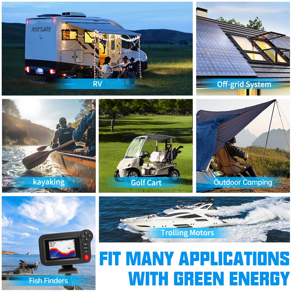 - 【Double Capacity than Other Batteries】weighs 22.71 lbs, only half weight and providing double capacity in the same size as lead-acid batteries, you can easy to move and install. And our LiFePO4 battery is 100% usable capacity compared with lead-acid battery only provide 60%~70% capacity, which can be tested by a percent state of charge meter. Suitable for most RVs including Winnebago, Thor Industries, Tiffin Motorhomes, Fleetwood RV and Newmar, etc.