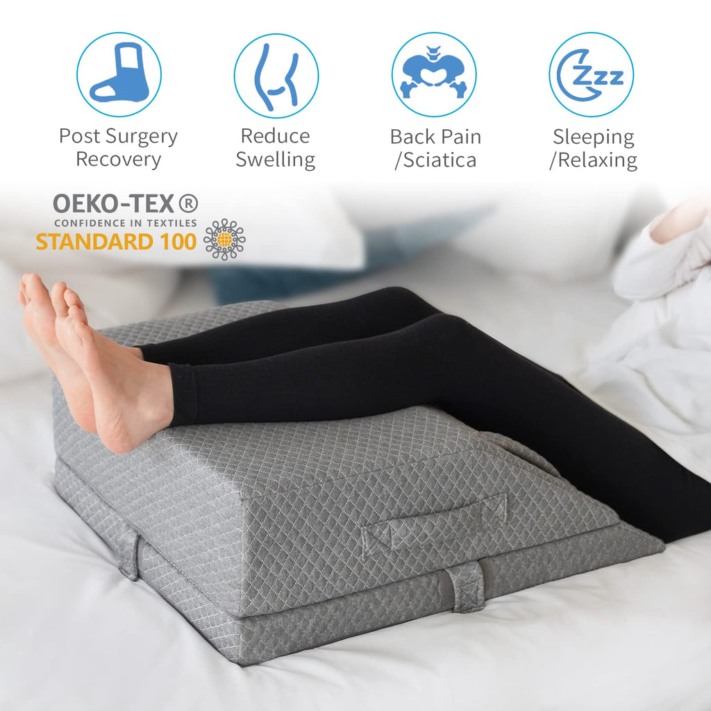 - Height-Adjustable Leg Wedge Pillow: We designed the legs pillow to be adjustable so that you can choose the suitable elevating height for your height. Plus you can add the bottom layer when sitting and remove the bottom layer when lying down, always keeping your legs at a comfortable height. The bottom piece and the main part are connected together by Velcros, easy to remove and reinstall.