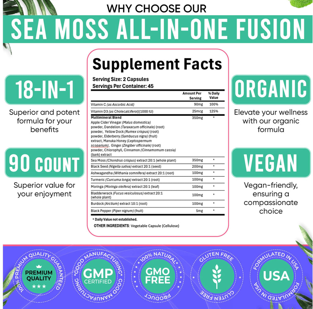 - Designed for universal wellness: Tailored for both women and men, this 18-in-1 Sea Moss Fusion offers a holistic solution for well-being. With diverse ingredients such as Bladderwrack, Manuka Honey, and Chlorophyll, this blend caters to various health needs, making it suitable for a broad audience. These seamoss black seed oil ashwagandha burdock root turmeric moringa capsules provide a good alternative to sea moss gummies, black seed oil gummies, turmeric gummies and ashwagandha gummies for women and men