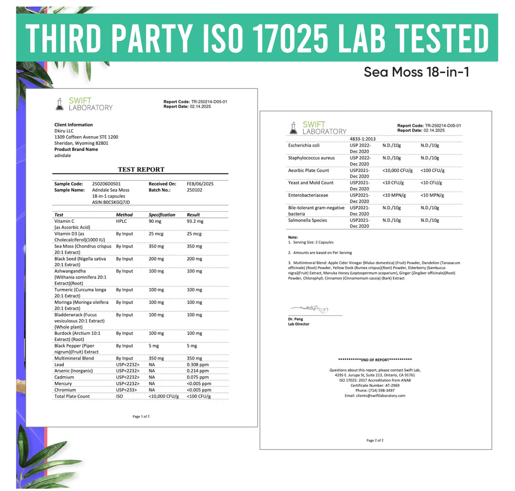 - Premium quality assurance: Rest assured with Adndale 3rd party ISO 17025 laboratory-tested supplement; ensuring premium quality and freedom from contaminants. Adndale's Sea Moss 18-in-1 Fusion capsules are vegan and free from gelatin, upholding Adndale's commitment to excellence