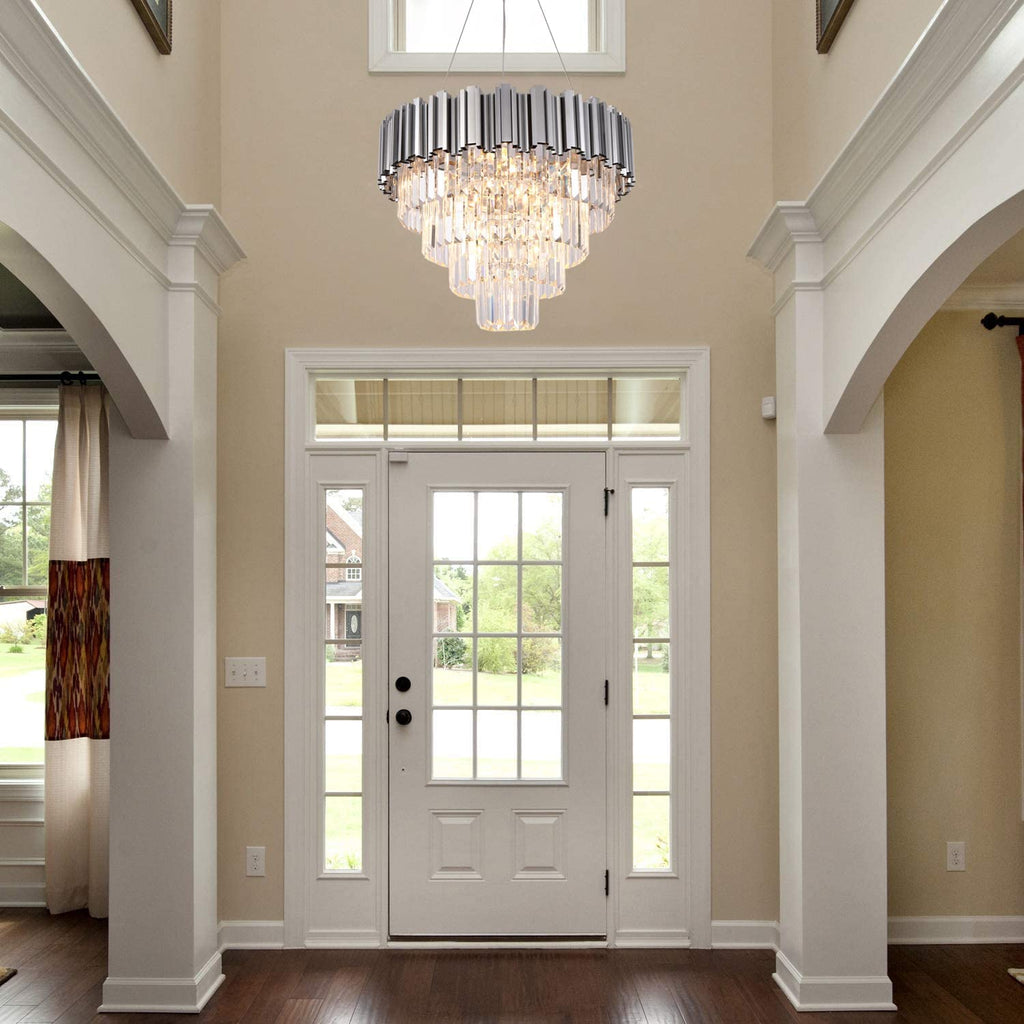 - Modern Chandelier: 4-Tier crystal chandeliers chrome 7 lghts pendant ceiling lights . Features a beautiful chrome finish frame along with stunning clear crystals, pure, romantic, shining like diamond, brings a chic modern look to your home. Absolutely will be wow at this statement piece.