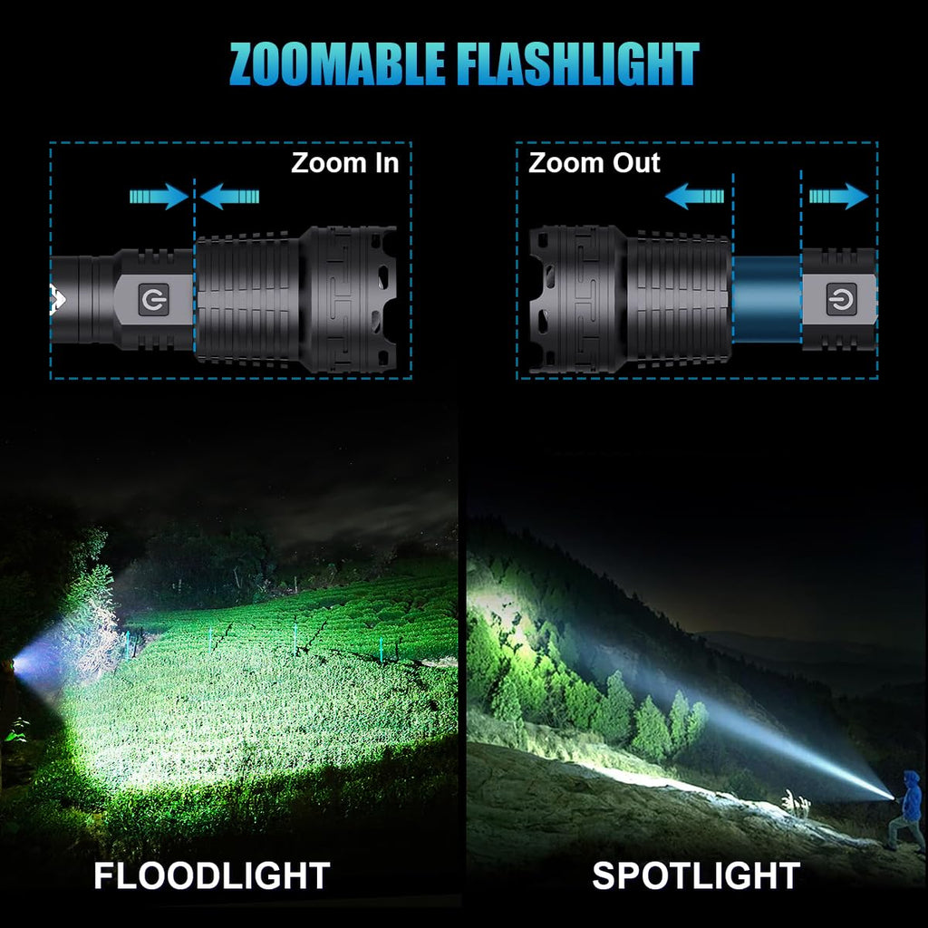 - 【990,000 LUMENS BRIGHTEST FLASHLIGHT】The LED rechargeable flashlights features new upgraded high lumen LED chips. This flashlights high lumens rechargeable has an incredibly high brightness of up to 990,000 lumens, which is 40 times brighter than a regular LED flashlight. It can easily illuminate an area of 4000 square feet.