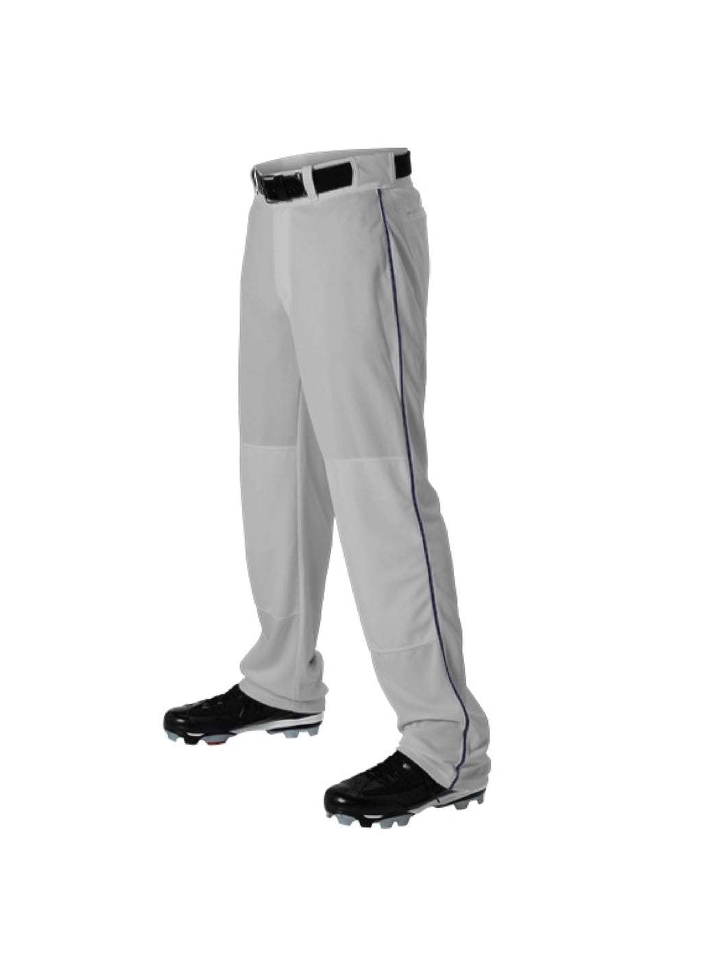 Youth durable Baseball pant with Braid down both side of pants. Single row, colored 3/16 inch soothe sewn down both sides of pant. Double knee construction with five Pro-Style belt loop. Relaxed fit with wide leg and open bottom non-traditional pant.