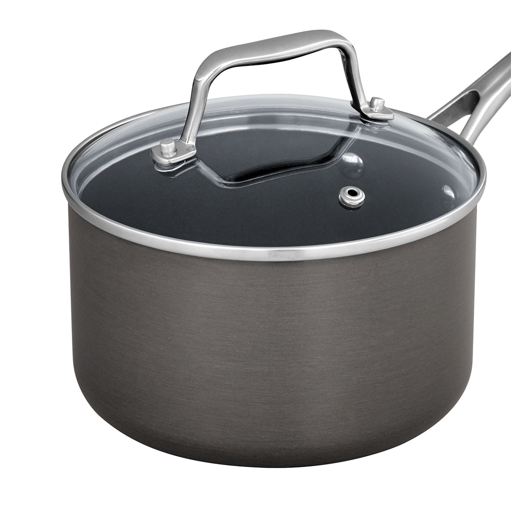 - This 2-quart saucepan will be your best friend in the kitchen. The hard-anodized aluminum exterior provides even heat distribution and is highly durable. A glass lid lets you cover to simmer or boil, and the non-stick interior is easy to clean.