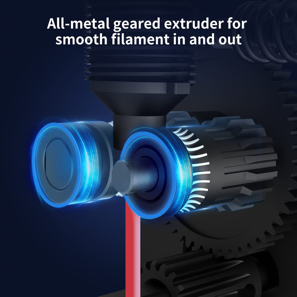 - 【Make It Precise】 Equipped with an all-metal geared extruder, which heats up and melts the filaments quickly, ensuring that the filaments are smooth extremely. At the same time, the 6000RPM dual fans allows the model to cool down quickly. Every component upgraded for easier printing and creative freedom.
