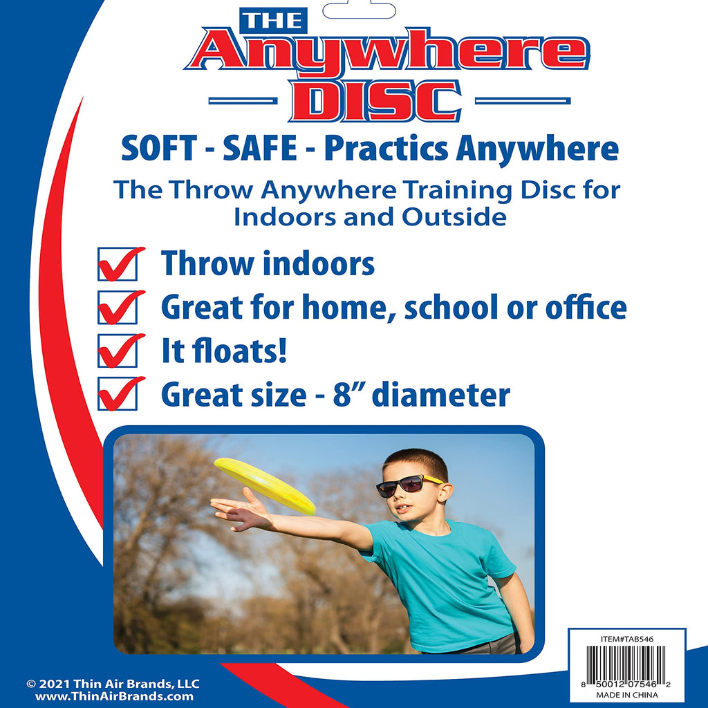 Details: SOFT FOAM FLYING DISC by ANYWHERE BALL The perfect foam flying disc for outdoor sports and play. So soft it won't hurt kids. Designed so accurately it has that wow factor kids want. This 9" authentically designed disc is unique in that you can throw it anywhere - indoors and outside - and it won't break objects. Great for youth practice, toddlers, and kids of all ages. Great for the pool, ocean, or lake because it floats! Fun in the office as well! Make sure you get this authentic Anywhere Disc by Thin Air Brands. The highest quality foam disc available. Excellent birthday or holiday gift! Boys and girls ages 3+