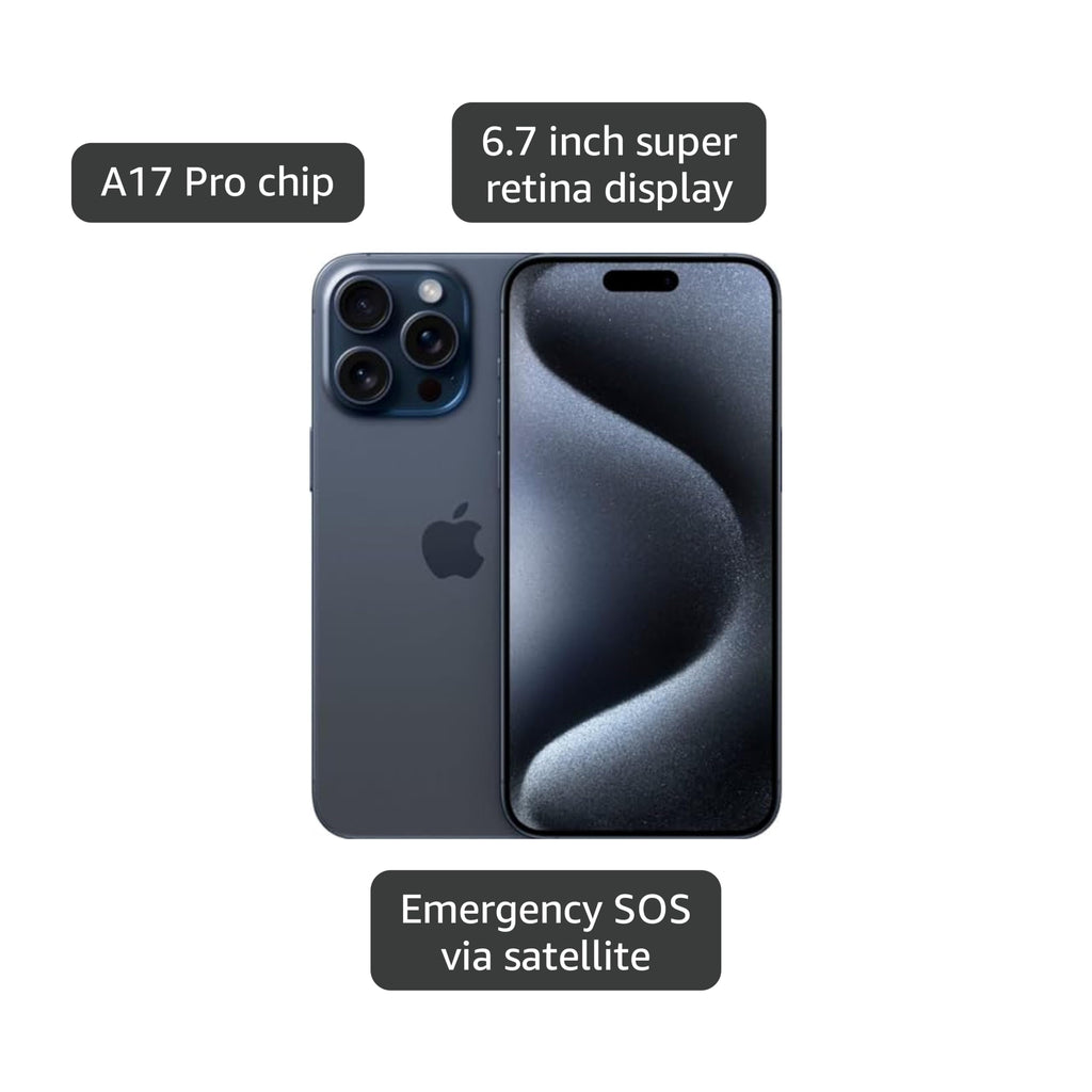 Details: The Apple iPhone 15 Pro Max features a durable titanium frame, a 6.7-inch ProMotion OLED display (120Hz, 2000 nits peak brightness), and is powered by the A17 Pro chip with a 6-core GPU, offering significant performance boosts for gaming and AI. Its standout camera system includes a 48MP Main sensor and a 12MP 5x Telephoto lens with tetraprism design, alongside a customizable Action Button and a USB-C port. Running iOS 17 (upgradable), it supports features like Apple Intelligence, Emergency SOS via satellite, and Crash Detection, with Ceramic Shield protection and IP68 water resistance.