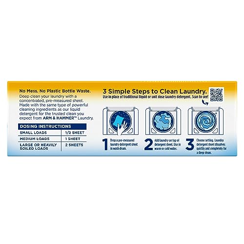 Details: For a powerful, deep clean without plastic bottle waste or mess, use ARM & HAMMER Power Sheets Laundry Detergent, Fresh Linen, 50 count, up to 100 loads. Are you concerned about your impact on the environment? If you are, ARM & HAMMER has designed this product to eliminate plastic bottle waste. Our new liquidless laundry detergent sheets use lightweight, recyclable boxes so no more lugging and pouring heavy, drippy bottles. This innovative laundry detergent sheet is ideal for travel—light, portable, convenient for laundromat or suitcase. Our no-bleach, concentrated laundry detergent sheets are tough on odors, dirt, and stains and feature a fresh linen scent. These HE detergent sheets handle tough loads of dark or white clothing in all wash temperatures, even cold water. Thanks to Quick Dissolve Technology, our high efficiency laundry detergent sheets dissolve completely in water. Use 1 sheet for medium loads or 2 sheets for large loads. Made with the same type of powerful cleaning ingredients as our liquid detergent for the trusted clean you expect from ARM & HAMMER Laundry.