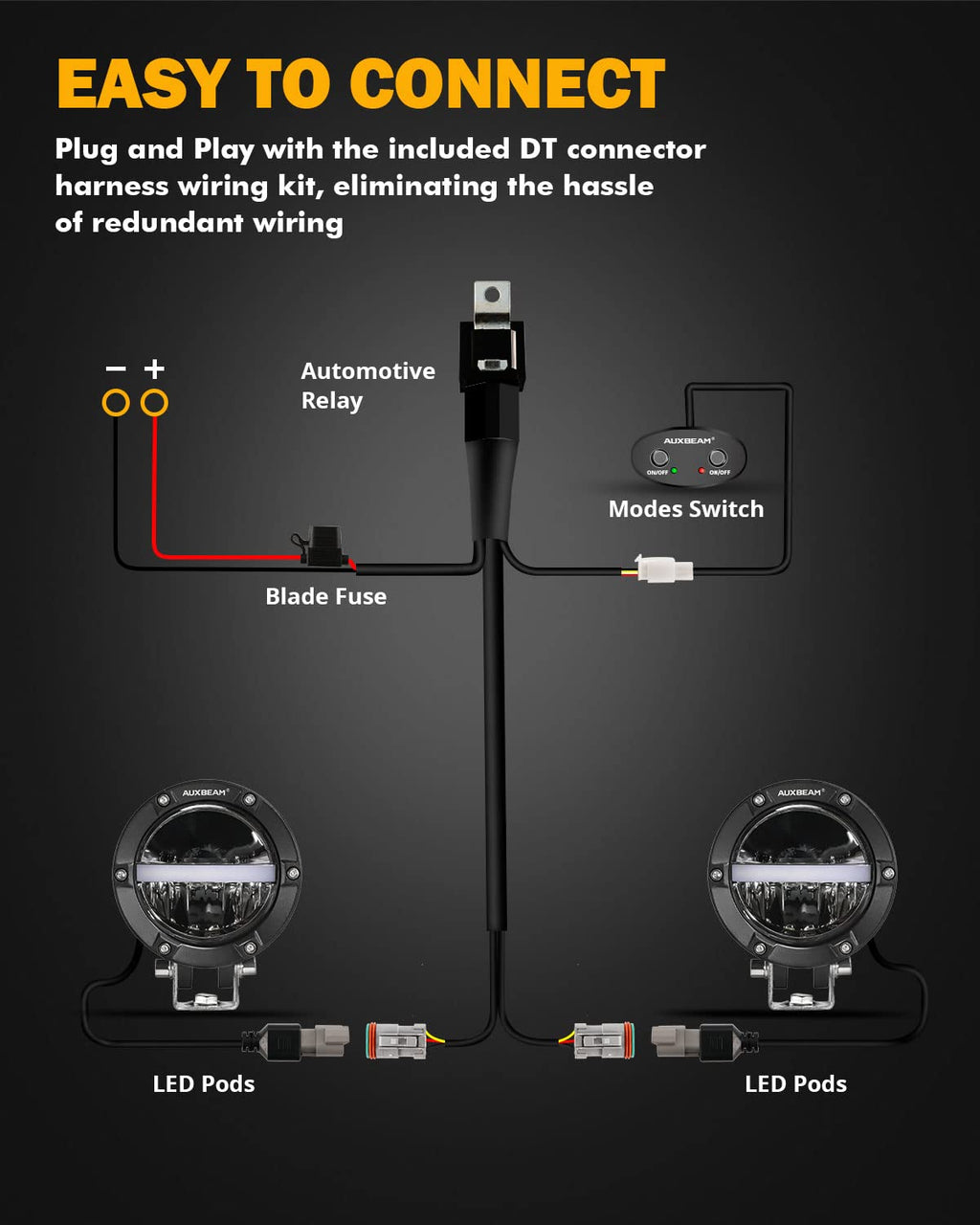 - 【Wide Application】Equipped with DT wiring harness kit, including fuse relay and switch, just plug and play. The installation is very simple and fast, eliminating the trouble of redundant wiring. Our 4 inch round LED fog lights are suitable for almost off road vehicles, motorcycles, ATVs, UTVs, SUVs, construction vehicles, farm vehicles, trucks, buses, pick-ups, marine, boat, etc.