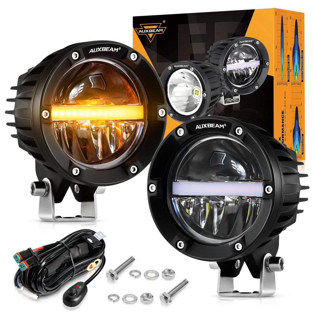 - 【Combo Beam with DRL Design 】Auxbeam 4 inch round driving lights with combo beam design can adapt to various road conditions. The latest upgrade 10 watt low energy amber light as the center daytime running light. If you encounter a more complex environment, the full power 110W 11000LM bright light provides you with a better and safer driving experience.