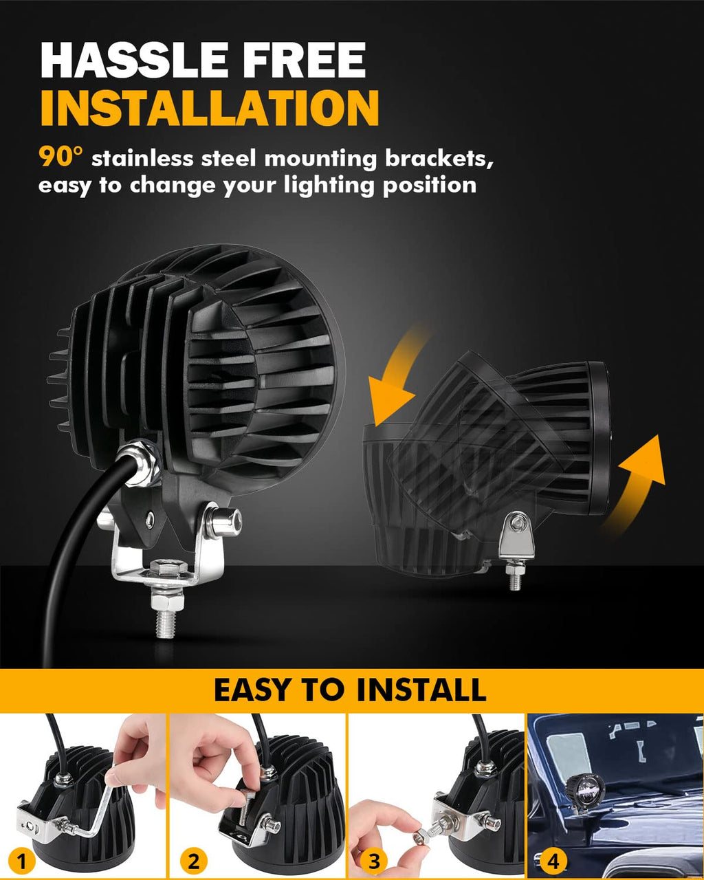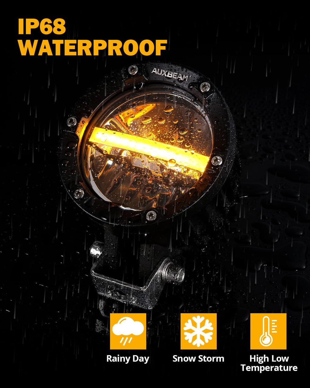 - 【Excellent Quality】Auxbeam 4 inch round LED light pods feature IP68 waterproof rating, high quality housing and sturdy brackets. This ensures that rain, fog, moisture or dust cannot seep into the 4'' round light pods and cause damage. With exceptional quality, you can trust our 4'' LED driving lights to perform flawlessly in a variety of harsh conditions.