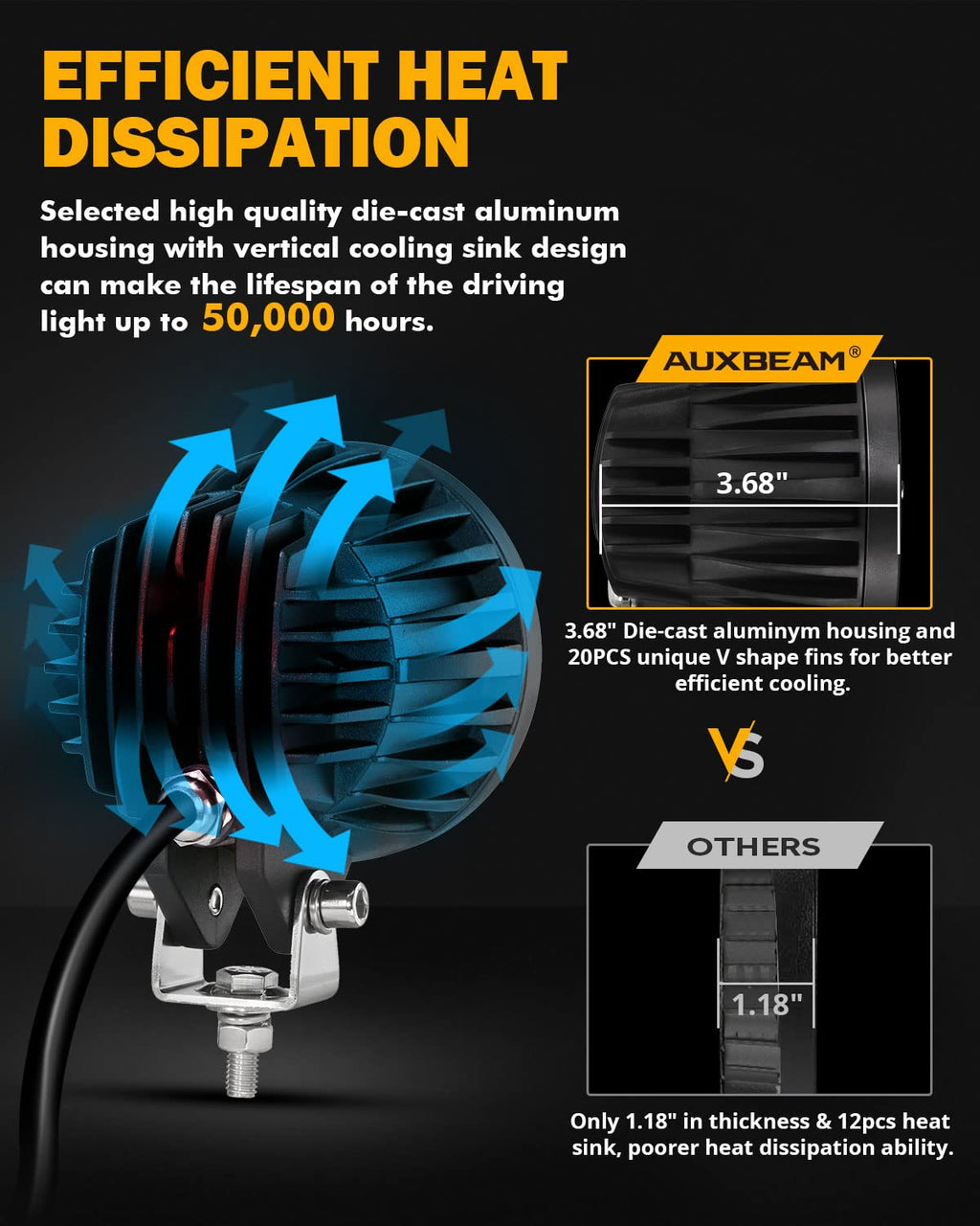 - 【Perfect Performance】Auxbeam 4 inch amber DRL LED pods are the perfect combination of performance and efficiency. The design of multiple cooling fins and 3.94 inches thicker aluminum alloy housing effectively shorten the cooling time and provide excellent heat dissipation effect. The energy-saving design and fast cooling radiator extend the service life by more than 50,000 hours.