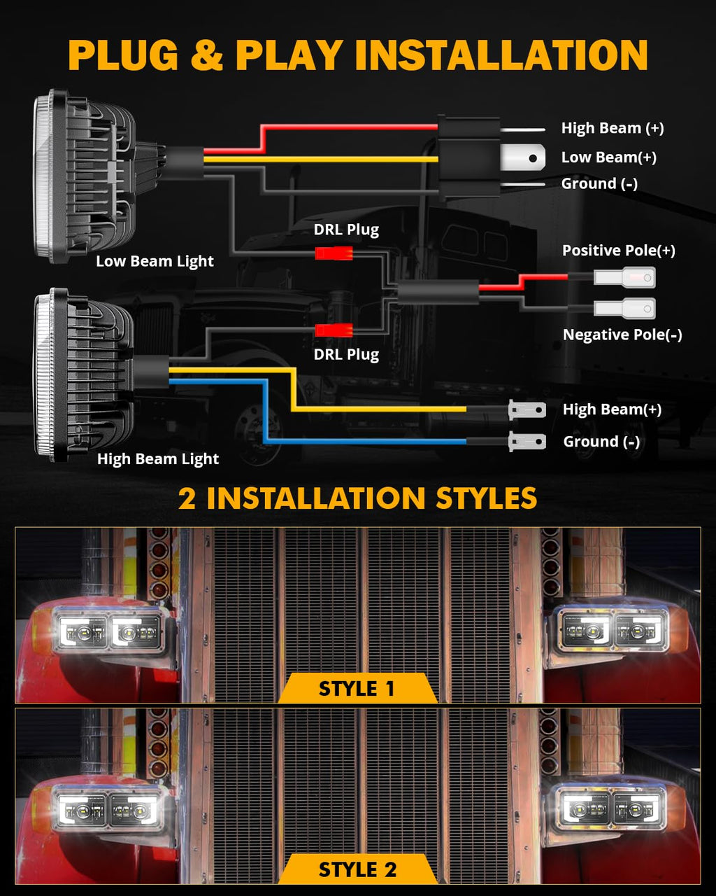 - 【ILLUMINATE YOUR PATH】Transform your driving experience with our state-of-the-art 4x6 inch LED headlights. Designed with separate high/low beam functions, these lights deliver a powerful 120W/pair output and an impressive 5200LM/pair, bathing the road in a stunning 6500K pure white glow. Whether you're navigating city streets or country roads, these headlights ensure you see and are seen. Note: Low Beam on, 2 lights are on, High Beam on, all 4 lights are on.