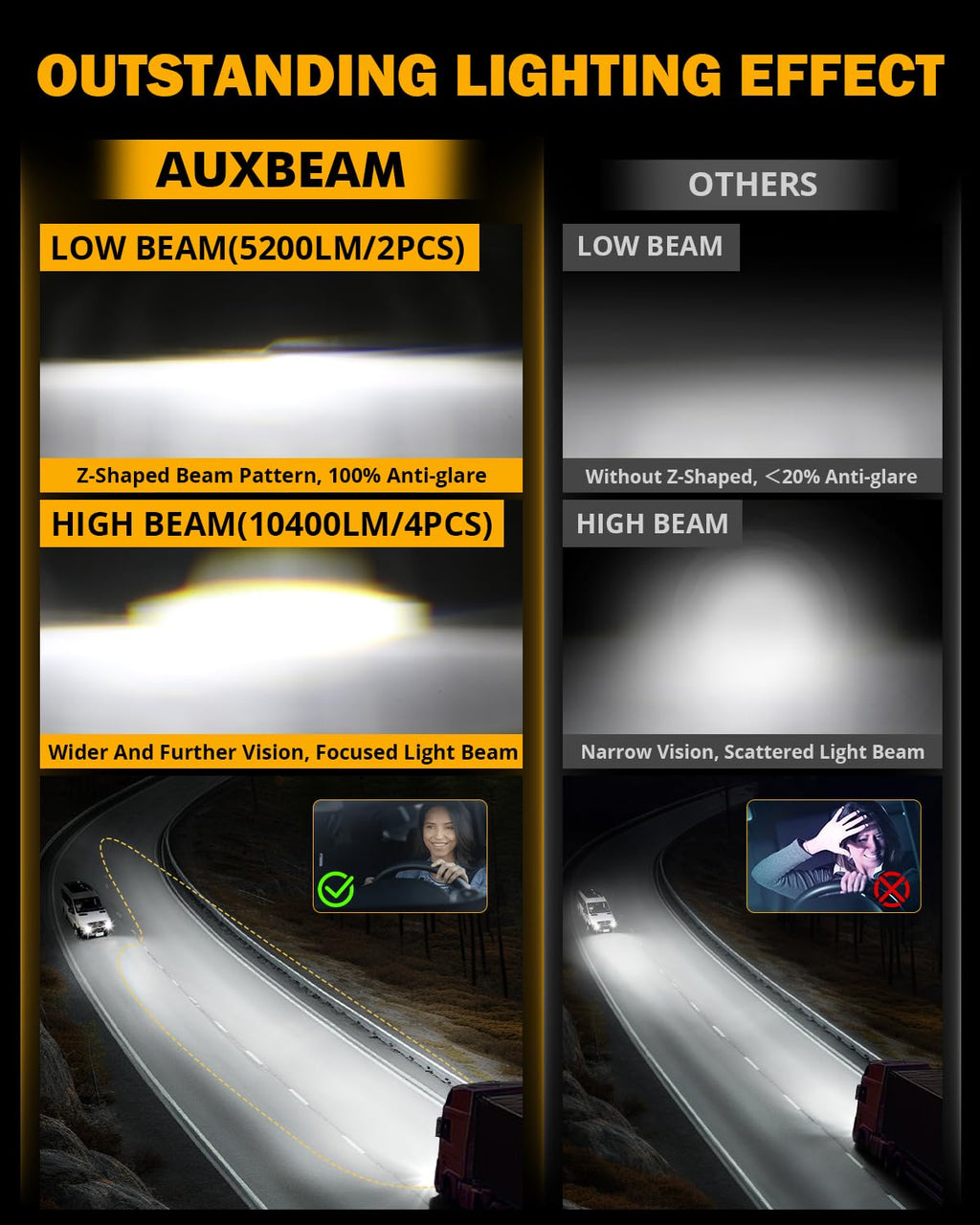 - 【CERTIFIED SAFETY】Drive with peace of mind knowing your headlights are fully compliant with DOT standards, approved for use across the U.S. and Canada. This certification guarantees that your 4x6 LED headlights meet the highest safety standards set by the United States Department of Transportation, protecting you and fellow road users. Also, 24-month guarantee and Auxbeam professional customer support are always here to be your backup.