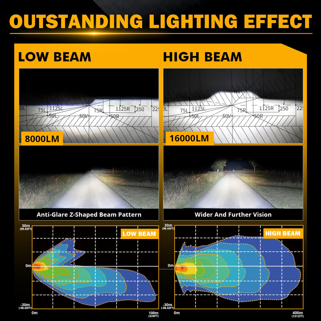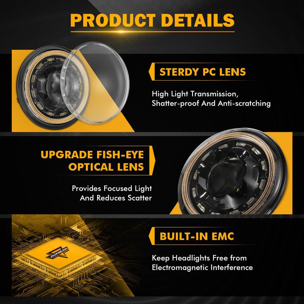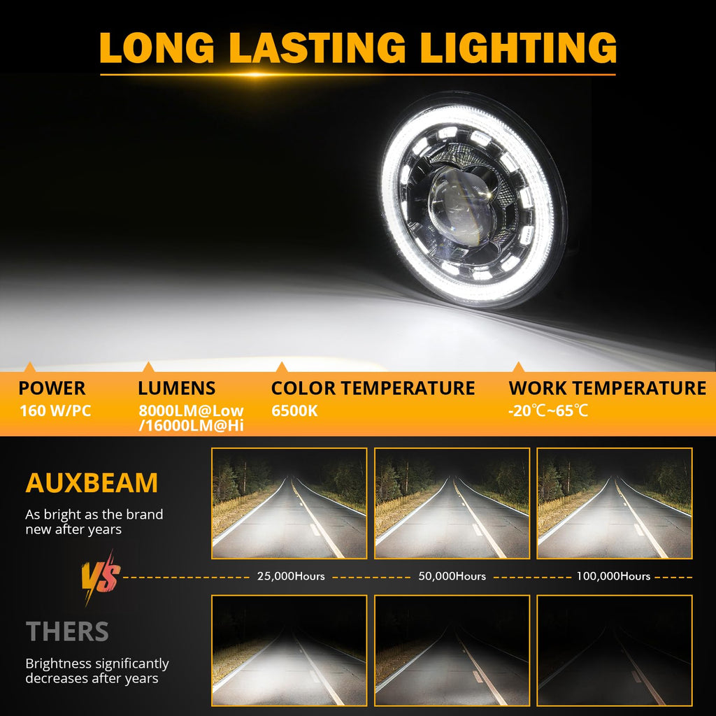 - 【LIGHT UP YOUR WAY】The Auxbeam 7 inch headlight is your perfect road companion with its 4 lighting modes: high beam (16000lm), low beam (8000lm), DRL, and turn signal. It's equipped with high-power LED chips, giving you the best beam out there. The low beam's Z-shaped cut-off line prevents glare, ensuring safety for you and others. The high beam offers bright, far-reaching, and uniform illumination, eliminating blind spots or dark areas. You'll get a clear view day or night.