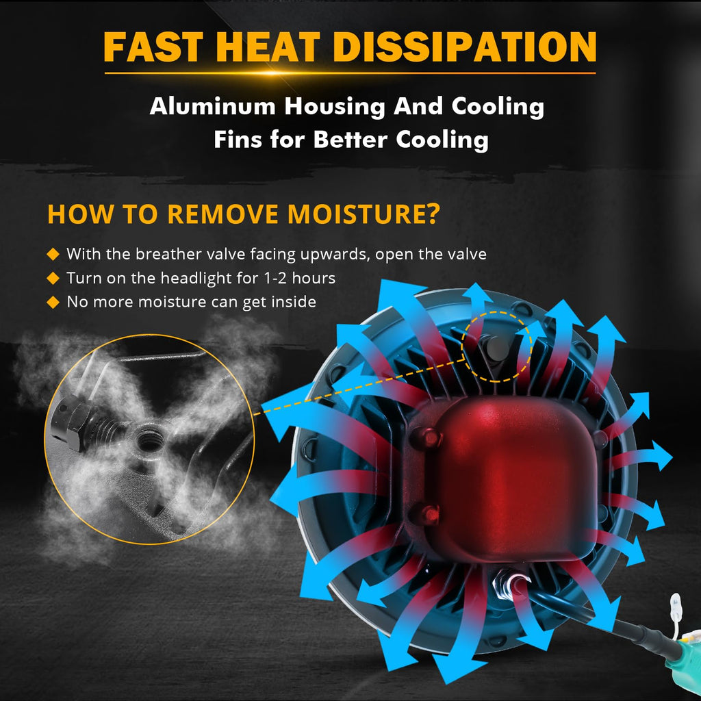 - 【BUILT TO LAST】With an IP67 waterproof rating, this fully sealed 7 inch LED headlight can withstand any harsh conditions. Its PC lens ensures better light transmission and is shatterproof and scratch-resistant. The aviation-grade aluminum shell and built-in heat dissipation module ensure a longer lifespan of over 100,000 hours. Even after a decade, it'll still shine as bright as new. Moreover, our headlights come with an integrated EMC anti-flicker that effectively guarantees no interference.