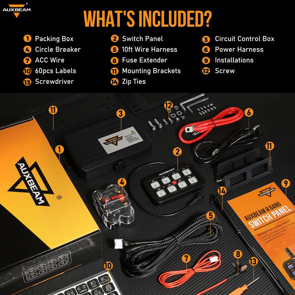 - Easy Installation: No complicated wiring, no need to cut a big hole on your vehicle. Plug & play wiring harnesses ensuring you to connect the led lights or accessories easily. Two types of mounting bracket, you can install it anywhere you need. You can customize your personal switch panel with 60pcs self-adhesive labels. The best way to clean up all the wiring and add a single panel to control everything.