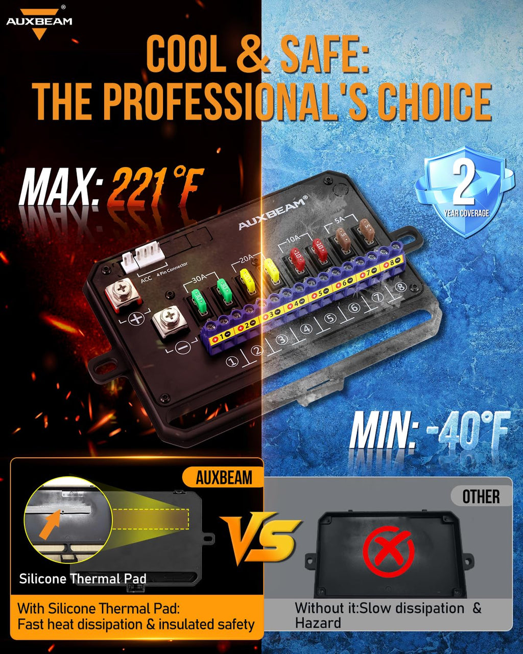 - 【Industrial Safety & Patented Design】This robust Auxbeam 8 gang switch panel features a solid-state relay with quadruple protection (Over-voltage, Reverse Polarity, Over-current, Thermal Cutoff) for absolute reliability. Its unique design, protected by a U.S. Design Patent, guarantees the superior single-side wiring that sets this Auxbeam switch panel apart from imitations.