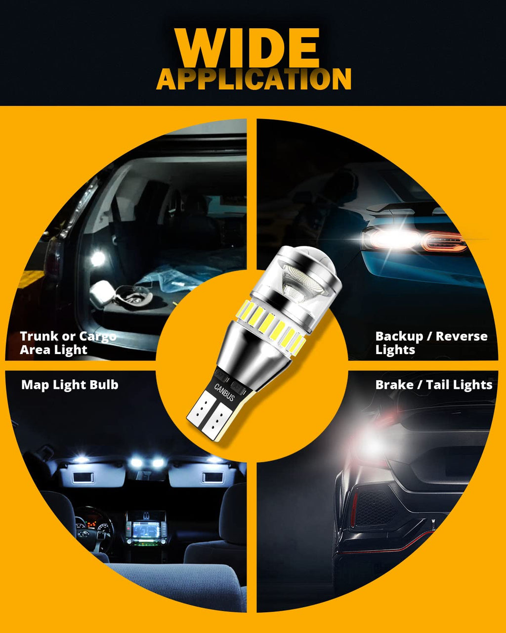 - 【5 Minutes Quick Installation】Resembling original halogen bulb size design, no polarity setting, no modification required, just Plug and Play. Compatible for 99% vehicles. Matching great in the assembly. Fit socket T15, 912, 921, 922, 906, 904, 902, W16W, 916, 916LL, 916NA, etc.