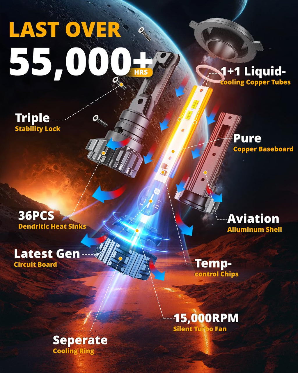 - MOST ADVANCED COOLING SYSTEM EVER: Five-layer cooling design - The red copper substrates + 6063 aviation aluminum lamp body + Unique 36PCs dendritic heat sinks + Latest double liquid-cooling copper tubes + 15,000RPM turbofan directly doubles heat dissipation, prolonging lifespan of H4 fog lights up to 55,000 hours to avoid frequent replacements.