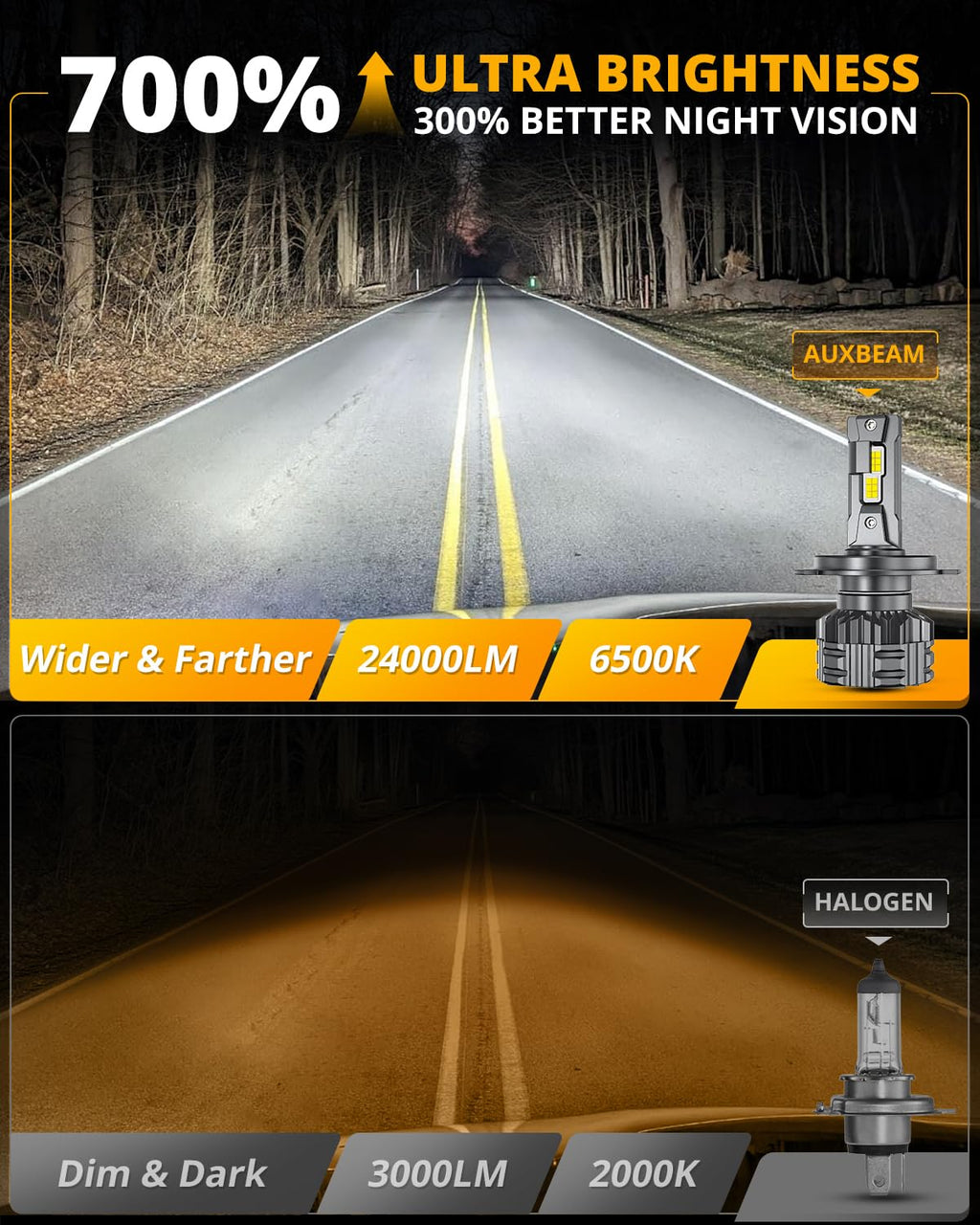 - 1500 FEET OF SUPER VISION: Upgraded 48 PCs Blade-X chip, 24,000 lumen and 110W high output arm you with a farther & wider lighting field. Auxbeam H4 fog lights focus on super brightness, providing 700% more light and 300% more night vision than original halogen ones for confident driving anytime. Say goodbye to those yellow dim stock ones and see what you wanna see clearly with super bright lights.