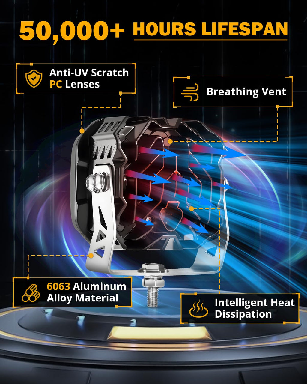 - 【RELIABLE CONSTRUCTION】 Designed for longevity, our lights boast a lifespan of over 50,000 hours. The high-quality aluminum alloy housing and advanced heat dissipation technology prevent overheating, ensuring consistent performance and reliability throughout their lifetime. Additionally, Our driving lights have built-in EMC technology to improve driving stability and provide a reliable lighting experience.