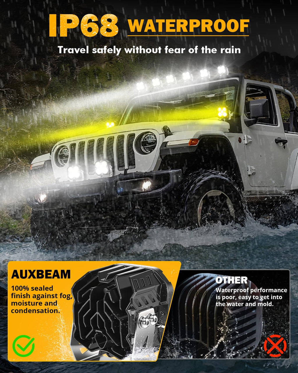 - 【IP68 EFFECTIVE WATERPROOF】The XP ULTRA Series Pod lights are designed to be triple waterproof, ensuring they can withstand harsh weather conditions. With a robust aluminum alloy housing and hardened PC lens, these lights offer exceptional durability while effectively resisting dust and moisture. Additionally, our lights undergo rigorous testing to meet international IP68 certification standards, guaranteeing reliable performance in challenging environments.