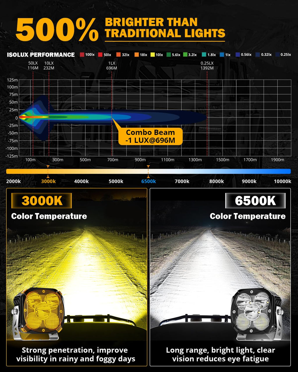 - 【TRUSTED DRIVING VISION】 Auxbeam 4.5-inch LED pod lights are equipped with advanced P8 and 3030 SMD chips, delivering a powerful 112W output and 12,800 lumens for superior brightness. With a lighting distance of up to 376 meters (1 lux measurement) and both 6500K white and 3000K yellow beam options, they provide broad, natural illumination to enhance safety during night driving.