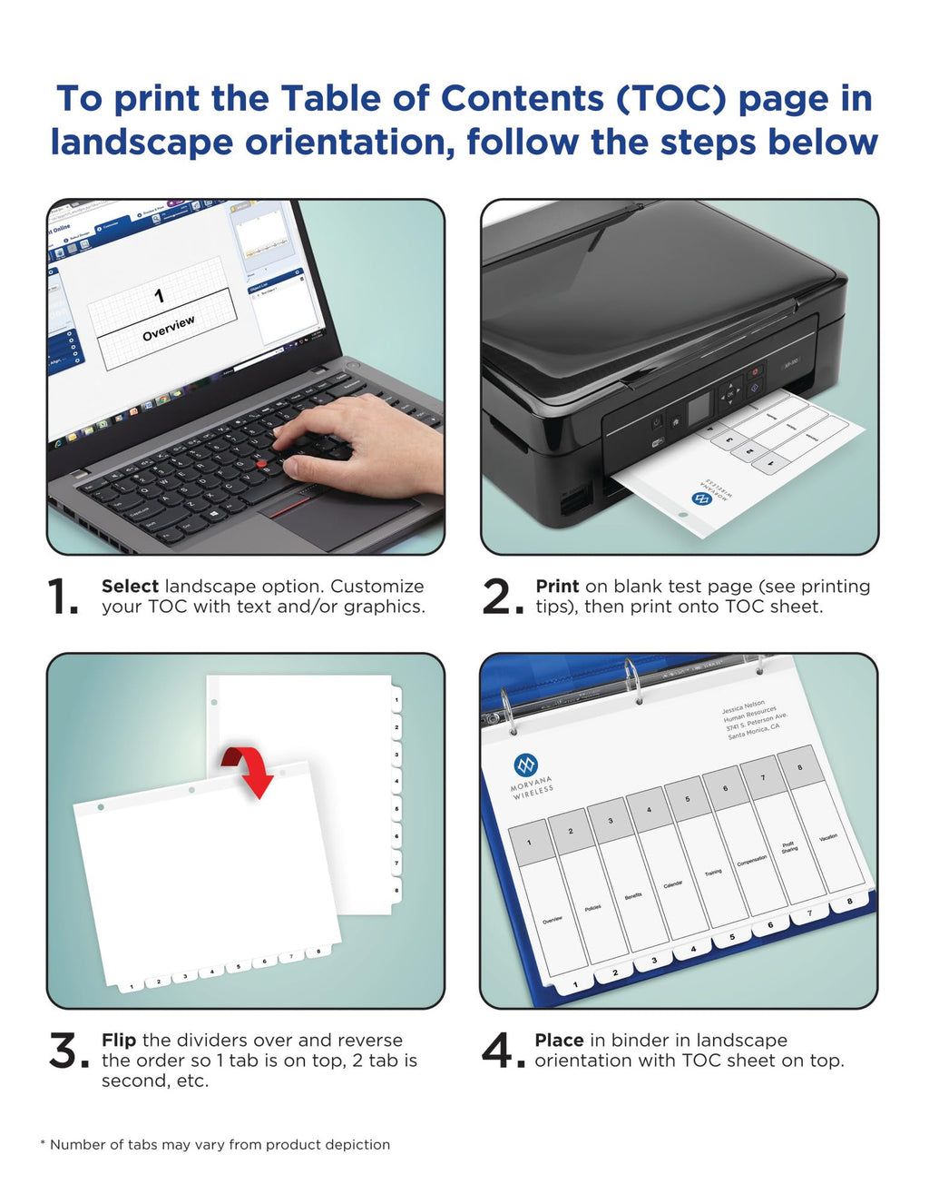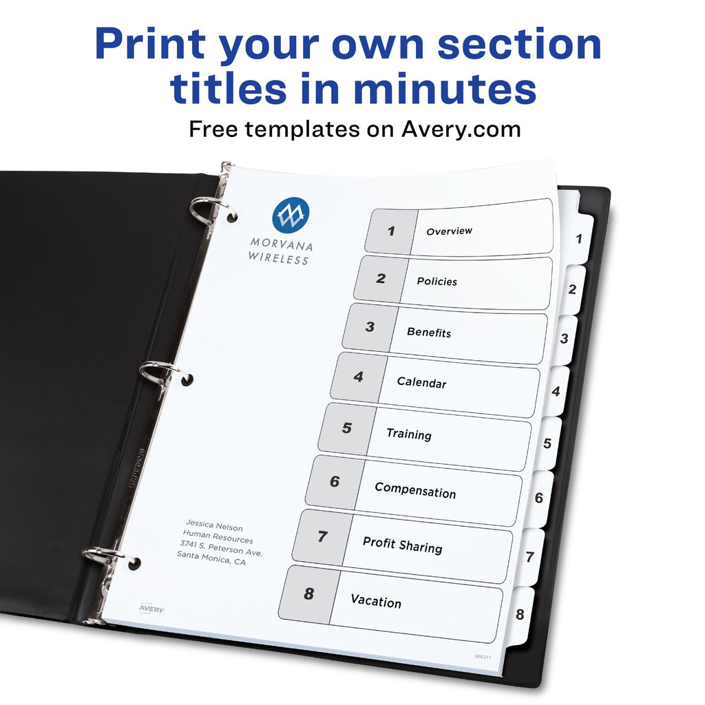 Details: Organize your projects in seconds with these 6 sets of Avery Ready Index 8 Tab Dividers. Each white tab is preprinted to present a professional look. Print customized section titles and images onto the table of contents sheet without worrying about inserts or labels. Whether you're hosting a meeting or creating binders for classes, these dividers are perfect for getting things sorted. 6 sets of 8 binder dividers are included with each sheet measuring 8-1/2?x11?. The 3 ring binder holes are reinforced on both sides of the heavyweight sheet to prevent tearing. The tabbed dividers also includes additional reinforcement along the edge of the sheet to distribute stress and resist creasing. The table of contents sheet is also compatible with both laser and inkjet printers. This sheet can be printed in either portrait or landscape so that projects can be organized in any orientation. Just flip the sheet over to view the other layout. Check out the free templates for these dividers and try out the Avery Design & Print software today on the Avery sites