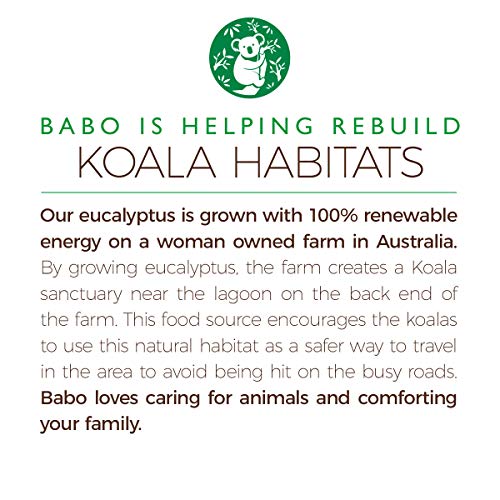 Details: USDA Certified Organic soothing chest Rub gently comforts, calms and relaxes. Soothes babies for more restful sleep when they have coughs and congestion. Soak in natural vapors of USDA Certified Organic comforting eucalyptus, Lavender and rosemary oil. Rub onto chest, neck, back and feet. Carefully formulated for extra sensitive skin. Our organic Tea Tree and natural eucalyptus is harvested with 100% renewable energy on women owned farm in Australia. By growing eucalyptus, the farm creates a Koala sanctuary near the lagoon on the back end of the farm. This food course encourages the Koalas to use this natural habitat as a safer Way to travel in the area to avoid to travel in the area to avoid being hit on the busy roads. Babo loves caring for animals and comforting your family.